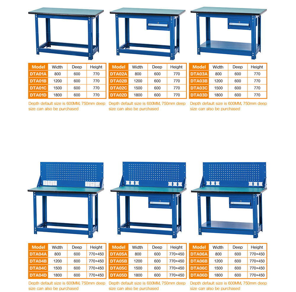 1.The DTA series workbenches are divided into 12 types according to the appearance configuration, DTA01 to DTA12. Delivery is based on the configuration of spare parts shipments, and additional configurations or drawers can be added as needed. In addition to the 800 wide worktables, up to 1200, 1500, 1800 long worktables can be configured with up to six drawers each, and there are three stacks on the left and right below the desktop, and three stacks on the right and below.